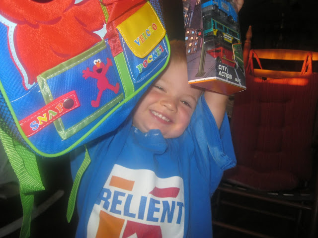 I got Tommy a back pack not because he goes to preschool - he doesn't, we are a homeschool family, but because he spends a lot of time every day packing toys into WalMart sacks and lugging them around. I thought a backpack would be something he would enjoy, and I was right. So far, it's the most played with thing he's gotten.