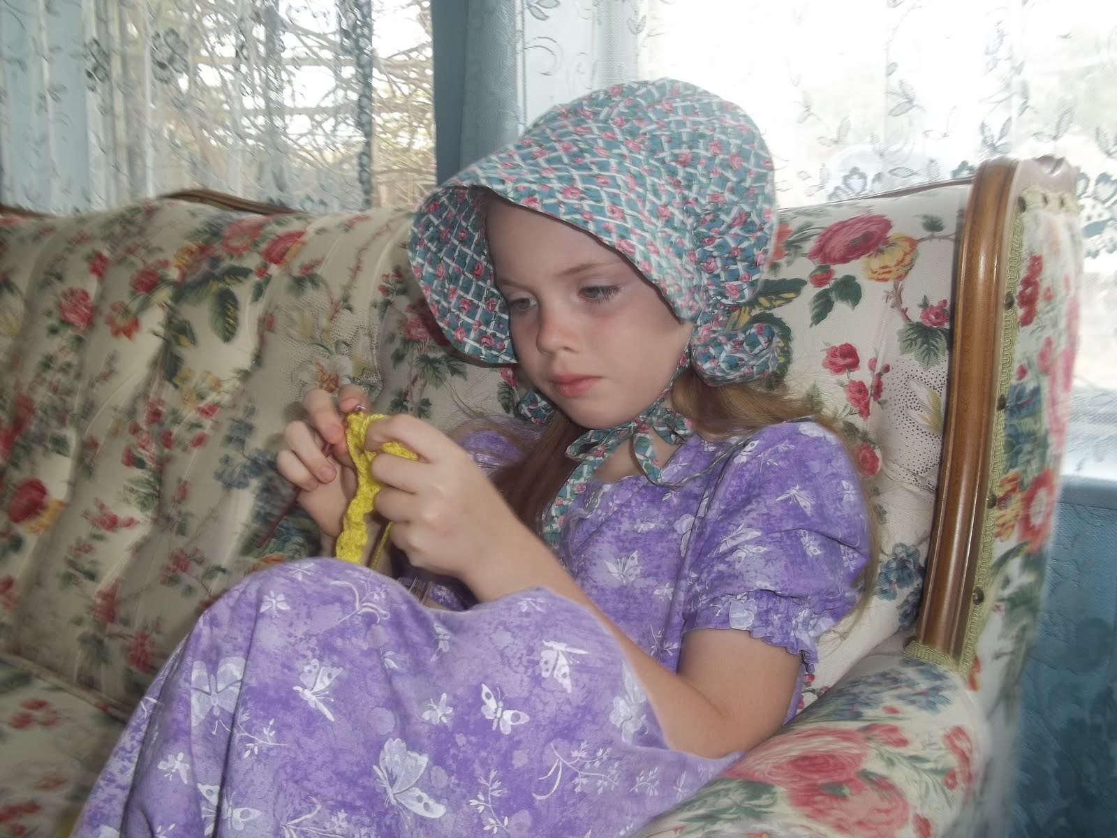 We redid the floors in Mary Susannah's room while she was gone earlier this week, and that bonnet was uncovered. It's been on Angel-Leah's head ever since. Fits her, doesn't it??